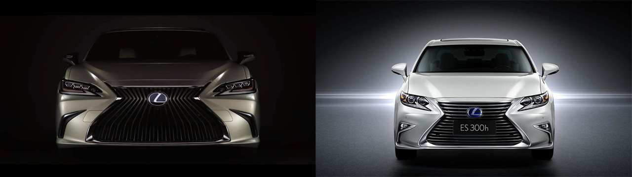 در نمای جلو خودرو بیش از همه جلو پنجره دوکی شکل معروف لکسوس خود نمایی می کند که اینبار بر خلاف نسل های قبلی دارای نوارهای عمودی است نه افقی.همچنین چراغها جلو این خودرو به تبعیت از لکسوس LS طراحی شده و نوار های کرومی دور هواکش روی سپر و دور جلو پنجره تکمیل کننده جذابیت تصویری لکسوس ES خواهد بود