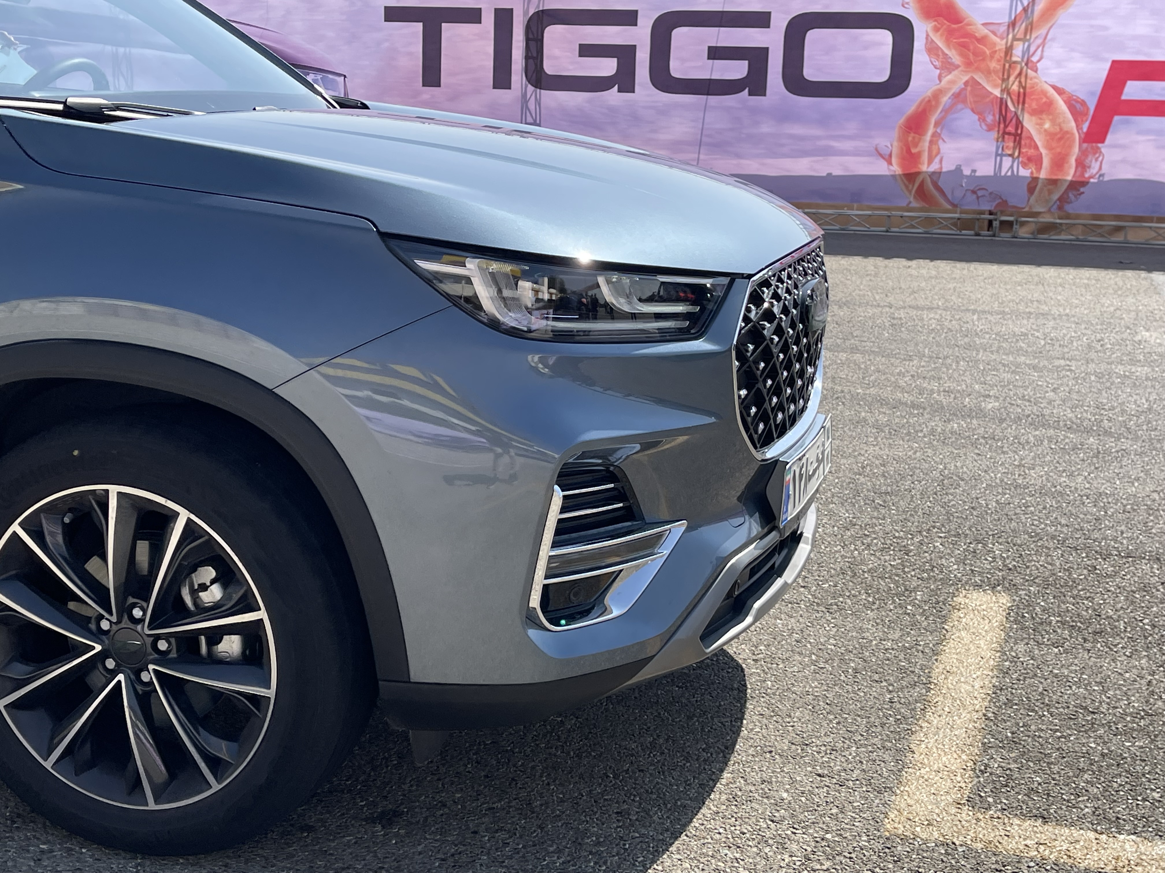 در دماغه این شاسی بلند ابتدا جلو پنجره بزرگ این خودرو که به سبکی نو طراحی شده و البته بیشتر فضای این بخش را در سیطره خود قرار دارد ، جلب توجه می کند.در طرفین آن نیز چراغهای اصلی خودرو قرار دارد که با دی لایت های کشیده ظاهری زیبا و البته عصبانی به تیگو 8 بخشیده است. تکمیل کننده نمای جلوی خودرو سپر بزرگ خودرو و البته مه شکن های خطی آن است که بر هیبت تیگو 8 پرو افزوده است.