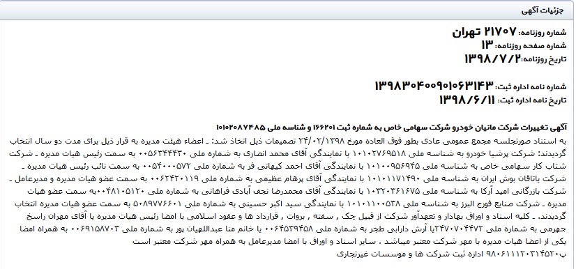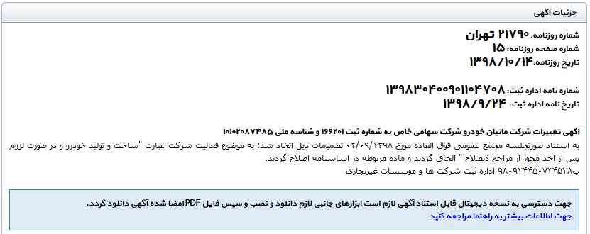 بر اساس اطلاعات موجود در وب سایت روزنامه رسمی جمهوری اسلامی شرکت مانیان خودرو تا قبل سال 98 با نام" گسترش طراحی و تولید قطعات آهنگری خودرو" با حضور شرکت های متعدد در راس هیت مدیره این شرکت فعالیت می نموده است. اما در تاریخ 98/5/3 اقدام به تغییر نام به "مانیان خودرو" نموده است.