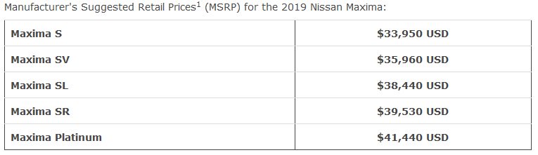 اما حالا ظاهرا این خودرو جذاب برای ورود به بازار آماده شده و نیسان مشخصات کامل تری از ماکسیما 2019 را ارائه کرده است. بر همین اساس نسل جدید این خودرو در پنج تریم 5 تریم S، SV، SL، SR و پلاتینیوم به نمایندگی فروش ارسال خواهد شد که نسخه پایه آن از قیمتی برابر با 33950 دلار برخوردار خواهد بود . این در حالی است قیمت تریم پلاتینیویم بعنوان فول ترین نسخه معادل 41400 دلار می باشد. البته به قیمت های فوق مبلغ 895 دلار بابت هزینه حمل و نقل اضافه خواهد شد.