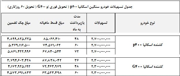 به گزارش پایگاه خبری "پردیس خودرو" شرایط بازپرداخت اقساط این خودرو 48 ،60 و 72 ماهه می باشد.همچنین مدت زمان تحویل برای کشنده اسکانیا P400 فوری و برای کشنده اسکانیا G400 شصت روز کاری می باشد. مبلغ تسهیلات برای کشنده اسکانیا P400 دویست و هفتاد میلیارد ریال و برای کشنده اسکانیا G400 دویست و سی میلیارد ریال می باشد.