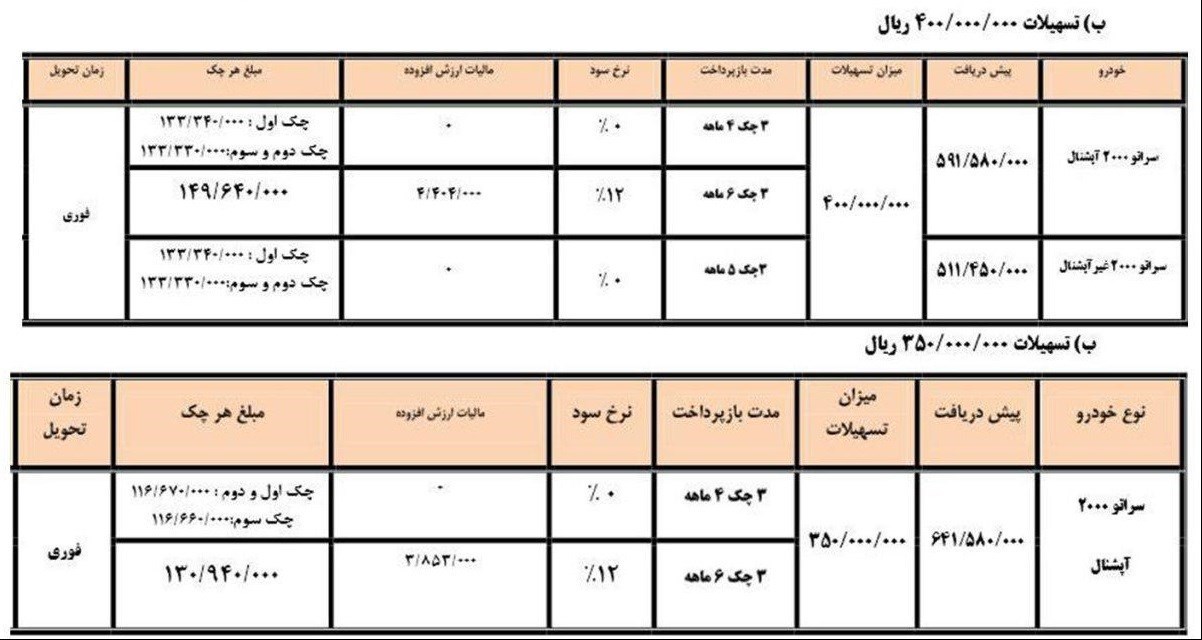 به گزارش پایگاه خبری "پردیس خودرو" شرایط فروش (نقدی و اعتباری) محصولات شرکت سایپا، خودروهای سراتو 2000 - آریو 1600 و چانگان CS35 از روز دوشنبه به تاریخ 96/07/03 ساعت 11 به مدت و تعداد محدود به شرح مفاد این بخشنامه ابلاغ می شود.